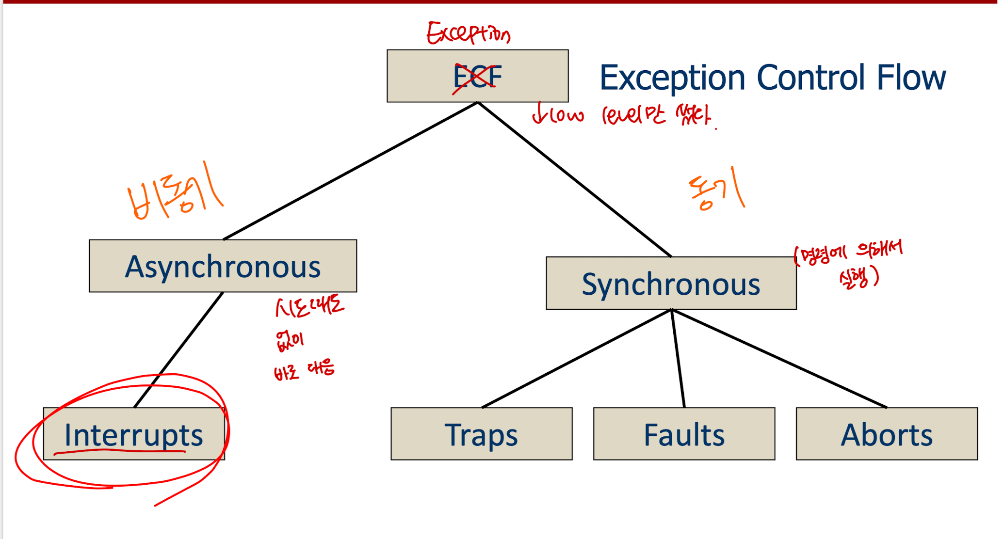 비동기의 경우, 현재 실행중인 명령어와 상관 없이 외부 이벤트로 발생한다.(키보드 입력, 디스트 i/o 완료 등)