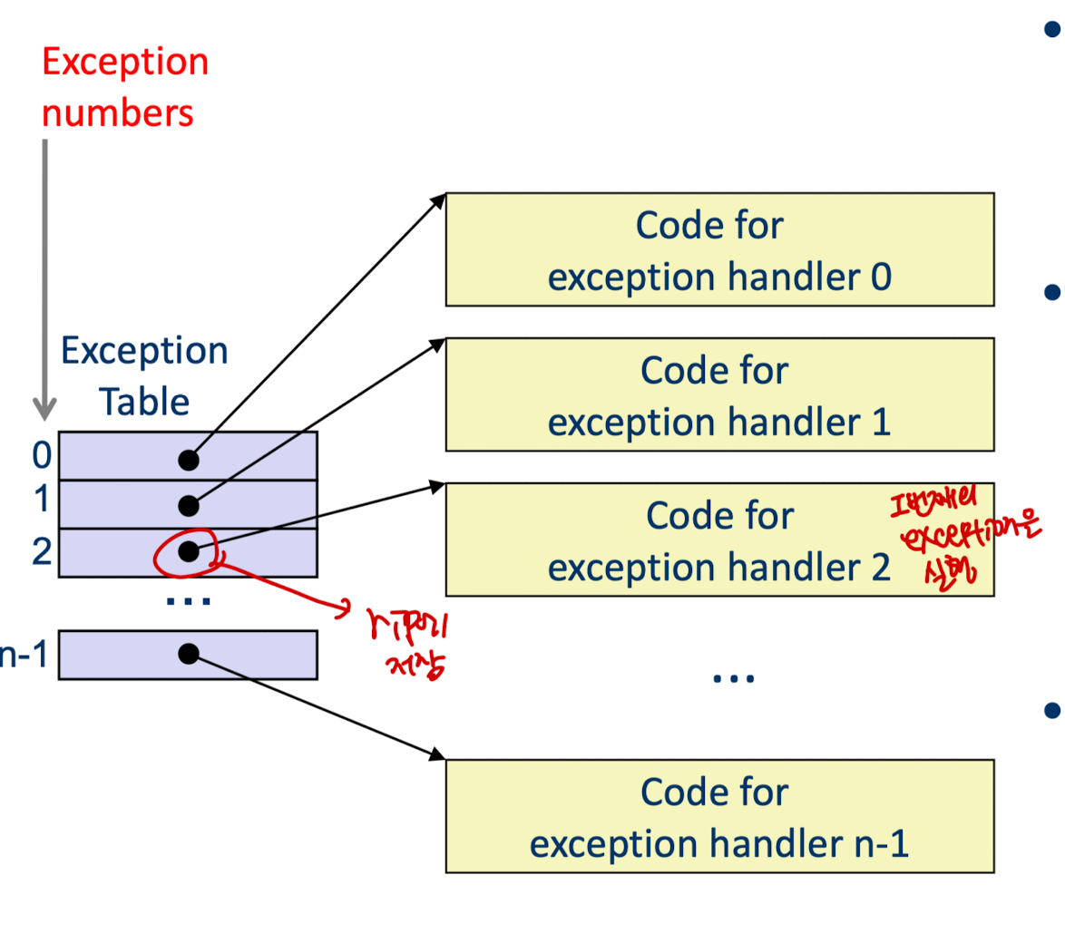 k는 exception table의 인덱스이다. 즉 0번 예외를 실행시켜야한다면, exception table 0번에 0번 exception handler의 첫번째 주소를 가지고 있으므로 이 주소를 현재 cpu 레지스터의 rip에 넣어 실행된다.(rip는 cpu가 다음으로 처리해야할 명령어의 주소를 적는 레지스터이다.)