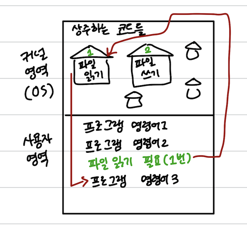 하지만 컴퓨터에 따라서 하드웨어에 접근하는 방식은 너무 다르고, 프로그램이 직접 하드웨어에 접근하게 하는건 위험하다. 따라서 각 컴퓨터마다 하드웨어를 다루는 코드는 커널 영역에 상주하고 있다.