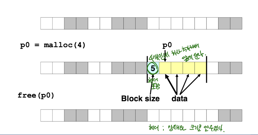 일반적으로 다음과 같이 블록의 헤더에 블록의 사이즈를 저장한다. 이를 위해서 매 할당 블록마다 추가적으로 1워드가 소요된다.