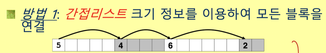 간접 리스트 방식은 헤더의 크기 정보를 이용하여 모든 블록을 연결하는 방식이다.