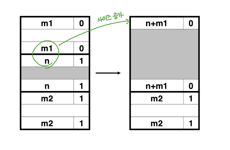 여기서는 free한 블럭의 뒷부분이 free상태이므로, 이를 병합하였다. 이 블럭의 사이즈는 n+m2이다.