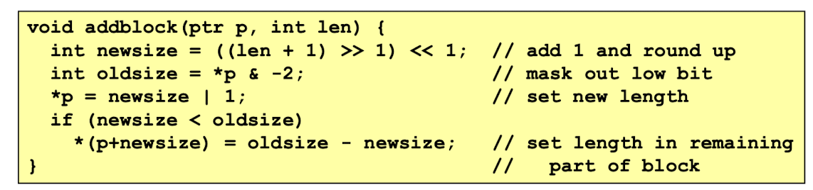 마지막 비트를 활용하기 위해서 블록의 크기는 항상 짝수를 유지한다.(사이즈가 짝수 -> 마지막 비트는 무조건 0, 근데 헤더의 마지막 비트가 1이다? -> 그럼 할당된 블록이라는 뜻임)
