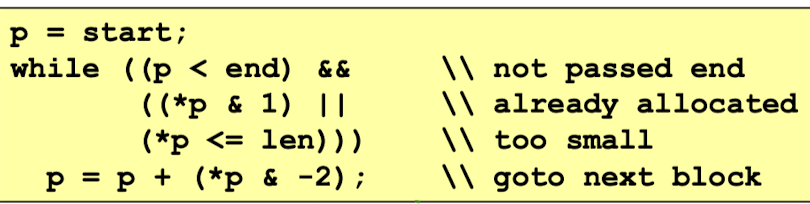 마지막으로 while문 안에 들어왔다는 것은 지금 보는 블록이 할당 가능한 블록이 아니라는 뜻이므로, p값에 현재 탐색한 블록의 헤더값에 -2를 and 연산하여 더해서 p값을 다음 블록의 가장 앞 주소로 이동시킨다.