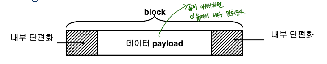 내부단편화는 주로 데이터 이외에 정렬을 위해 바이트를 추가하거나, 헤더 등의 오버헤드 때문에 발생한다.