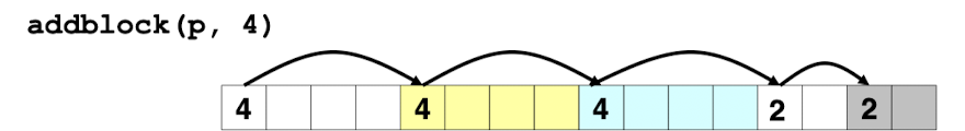 그 다음 뒤에 남은 free 블럭의 사이즈를 남기기 위해서 P + newsize를 하여 해당 free 블럭(크기가 2인 블럭)의 맨 앞으로 이동한 다음, 해당 위치에 oldsize-newsize를 한 값을 넣어 사이즈를 표시한다.(이때 oldsize와 newsize는 모두 짝수이므로, 끝 비트는 무조건 0이다. 따라서 끝 비트를 0으로 만드는, 즉 빈 블럭임을 표시하는 작업은 하지 않는다.)