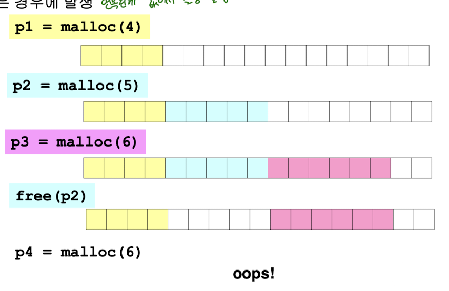 외부 단편화는 위와 같이 전체 free 메모리를 합쳐보면 수용이 가능하지만 free 블록 각각의 크기가 할당을 원하는 데이터의 크기보다 작아서 발생한다.