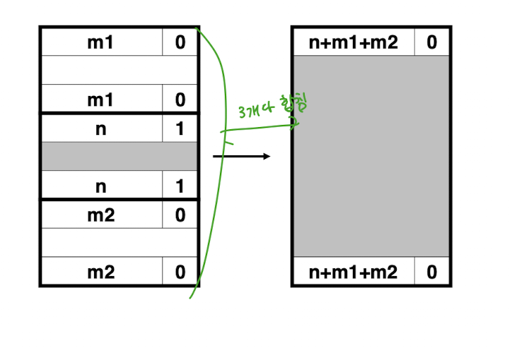 여기서는 free한 블럭의 뒷부분이 free상태이므로, 이를 병합하였다. 이 블럭의 사이즈는 n+m2이다.