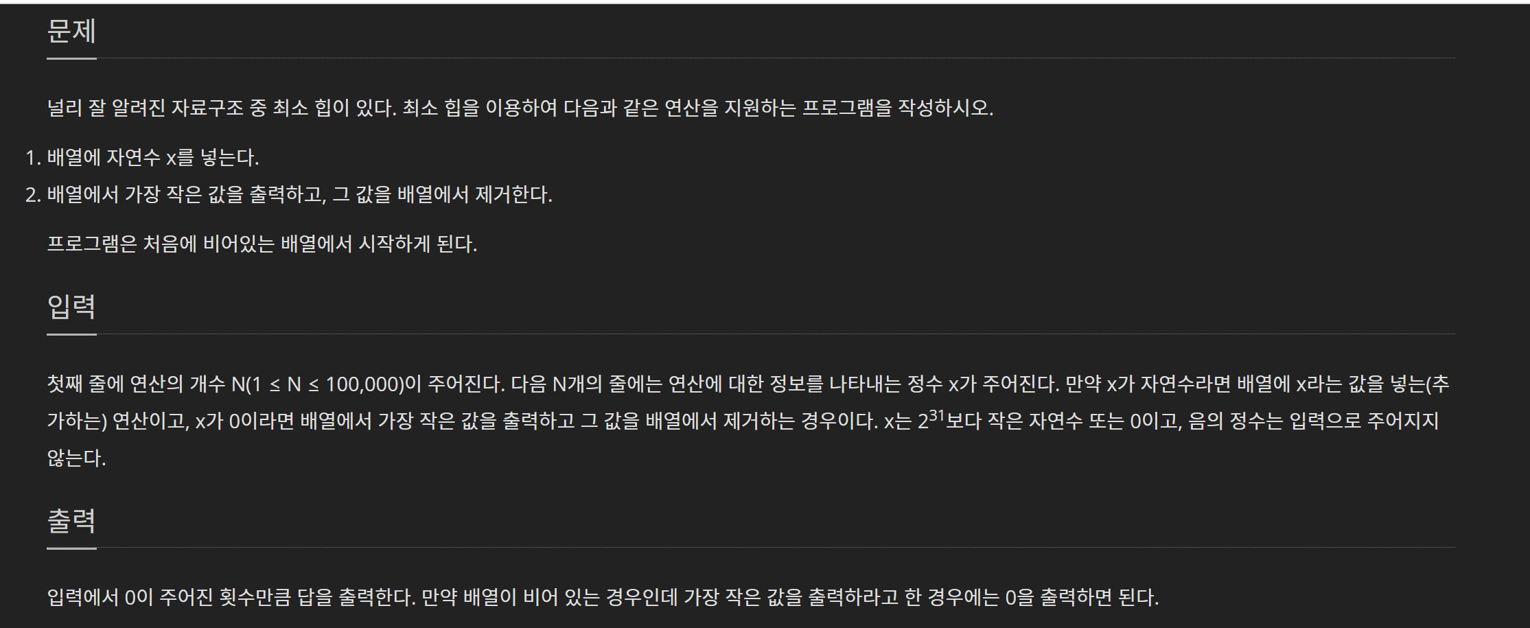 수들을 입력받고, 0을 입력받을 때마다 이제까지 입력받았던 수 중 가장 작은 수를 출력하고 poll한다. 이외의 수를 받으면 힙에 수를 offer한다.