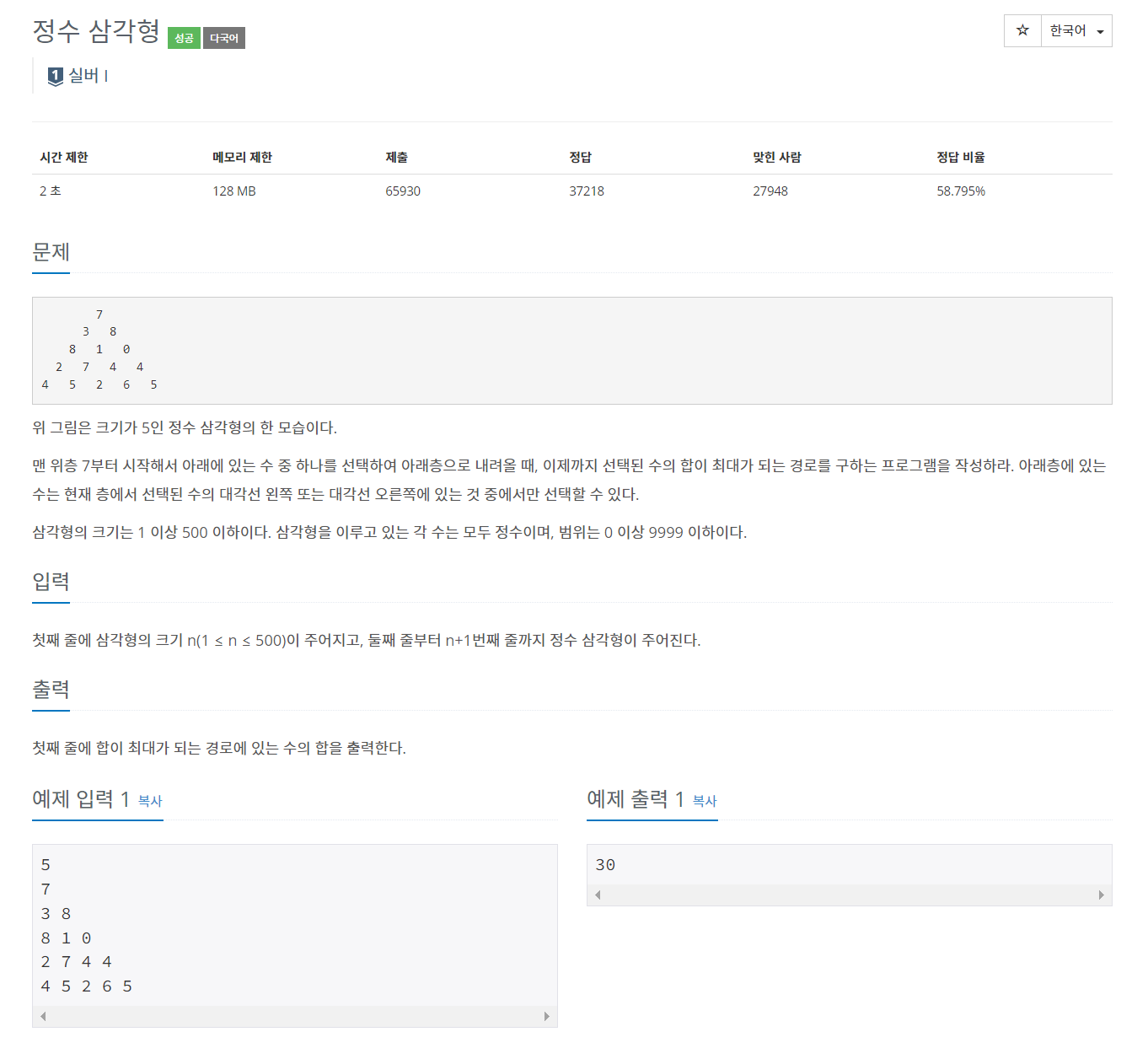 이 문제는 정수 삼각형의 꼭대기에서 1층으로 내려올 때 가장 큰 값을 구하는 문제입니다.