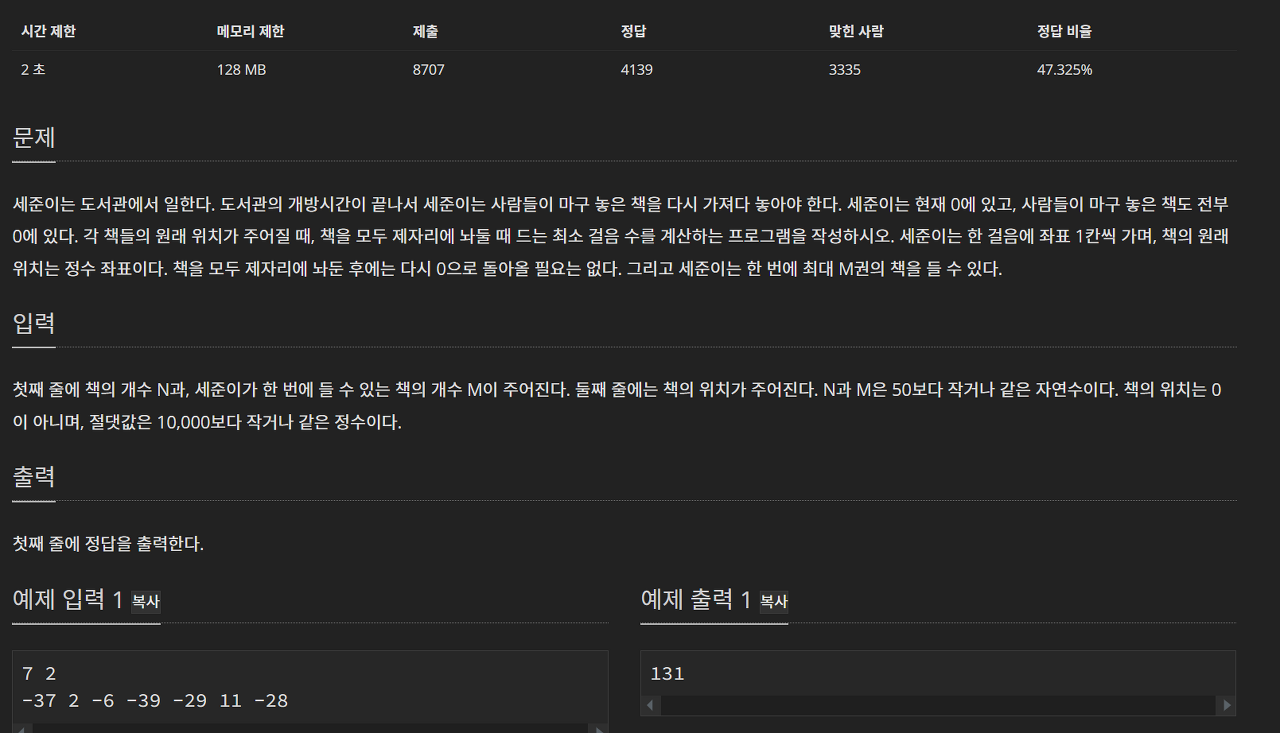 https://www.acmicpc.net/problem/1461 1461번: 도서관 세준이는 도서관에서 일한다. 도서관의 개방시간이 끝나서 세준이는 사람들이 마구 놓은 책을 다시 가져다 놓아야 한다. 세준이는 현재 0에 있고, 사람