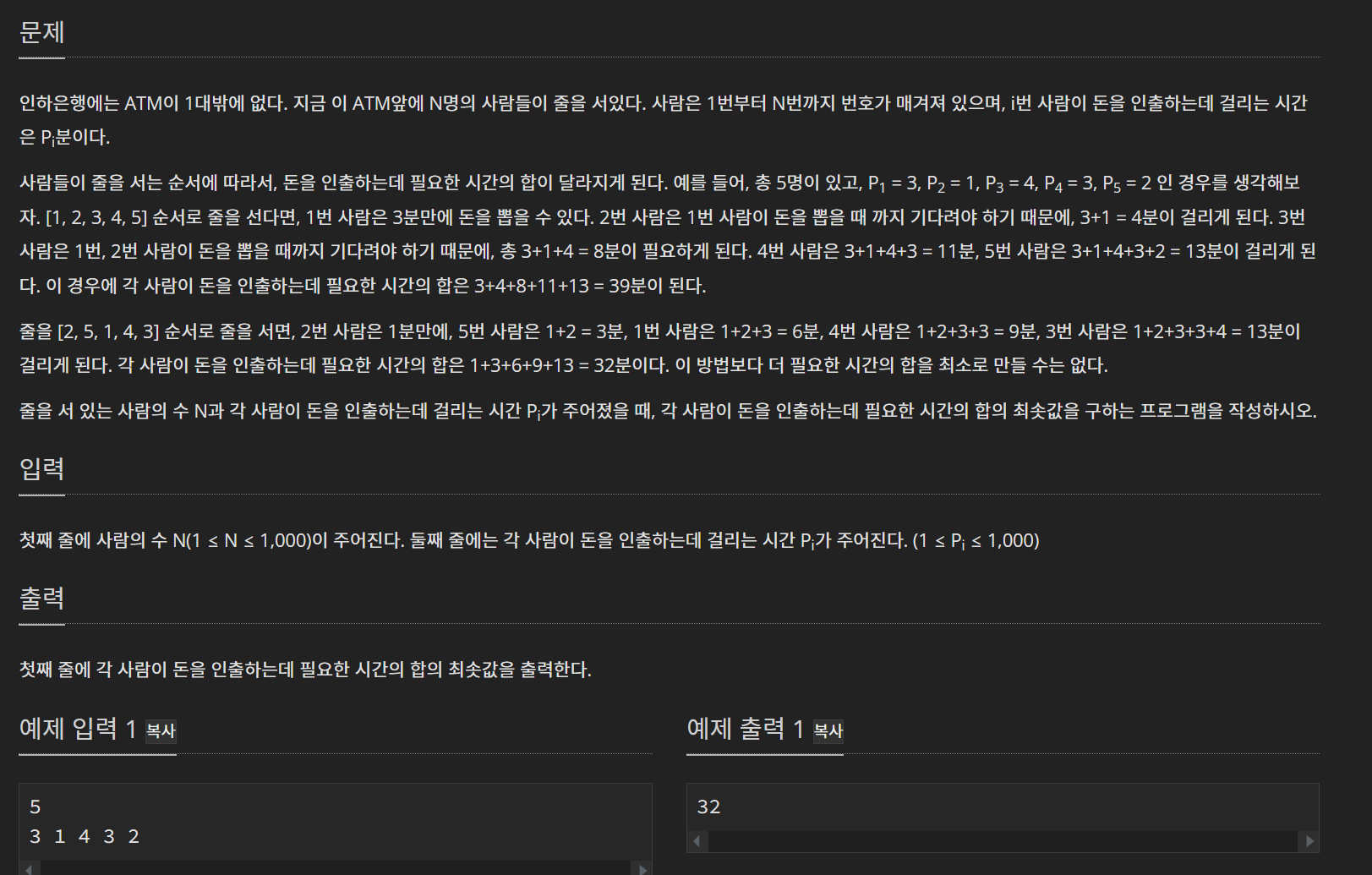 사람마다 atm을 이용하는 시간이 주어지고 이를 사용하는 사람들이 기다리는 전체 시간의 최솟값을 출력하는 문제이다. 이때 이용시간이 작은 사람 순서대로 정렬한 후 이 순서대로 atm을 이용하면 되니까, 정렬한 후 여기다가 (전체사람 수 - 해당 수의 배열 순서)를 곱하면 된다. (첫번째 사람이 돈을 뽑을 동안 기다리는 사람들의 수는 전체이고, 두번째 사람이 돈을 뽑을 동안 기다리는 수는 전체-1이니까)