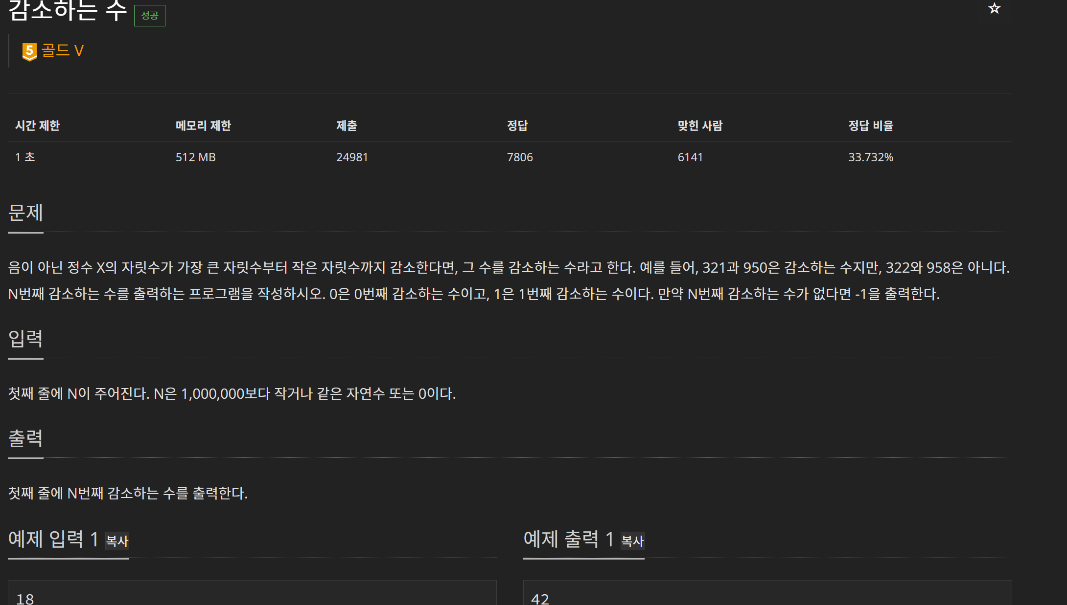 처음에는 수학적인 규칙을 찾으려고 했지만 쉽지 않았고, 감소하는 수가 많이는 없다는 것을 알고, 모든 감소하는 수를 찾아 정렬하고 구하는 방식을 사용했다.