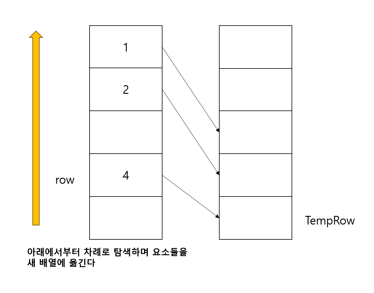 row는 기존 배열에서 탐색하고 있는 줄을 나타내는 변수이고, tempRow는 새로운 배열에 넣어야 할 줄을 나타내는 변수이다.