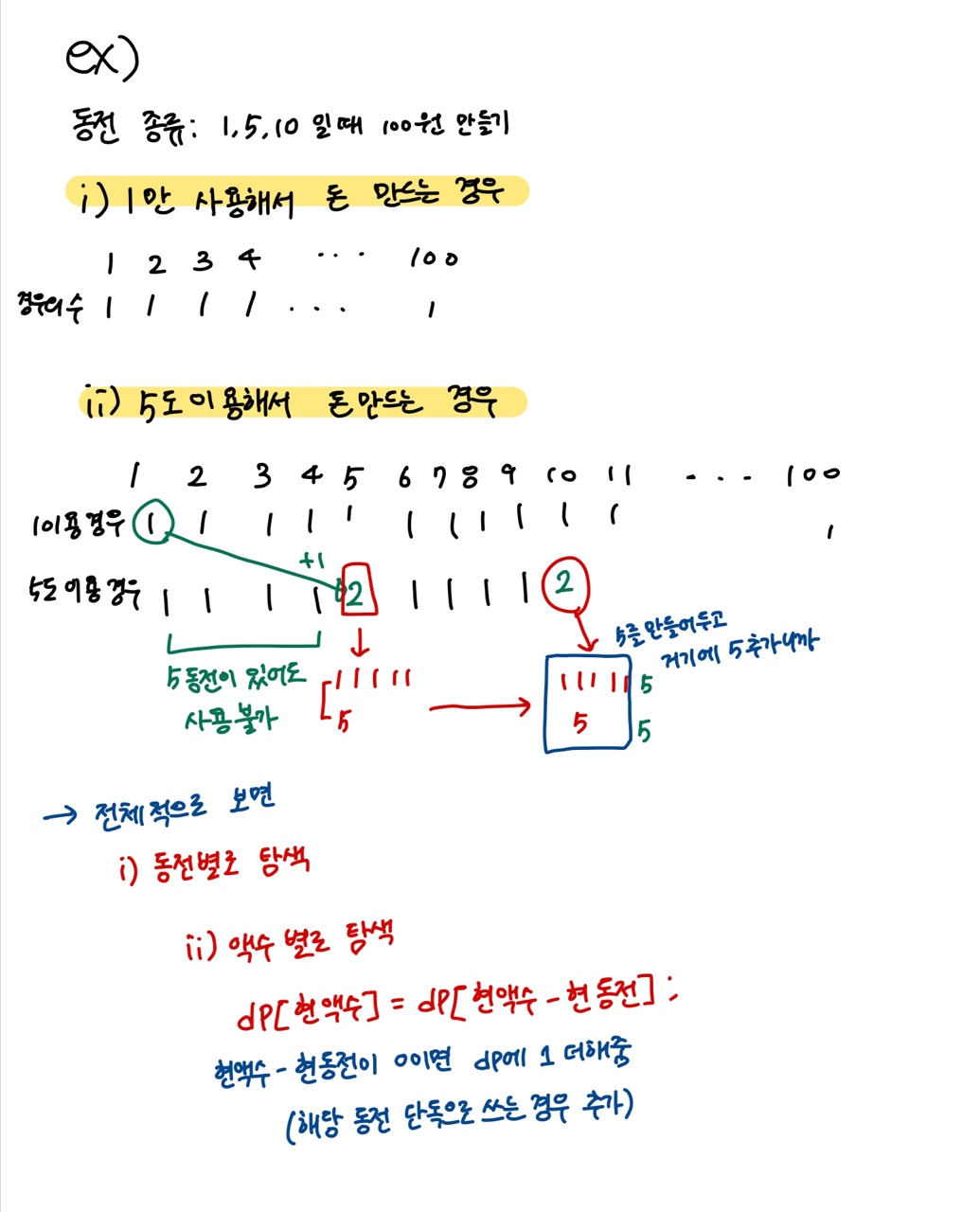 일단 풀이법을 그림으로 정리해보았다. 글씨가 정말 별로지만, 이해하는데는 확실히 도움이 되었다. 일단, 동전의 수가 주어지고 동전의 액수가 들어오면, 해당 액수만큼 dp배열을 만든다.
