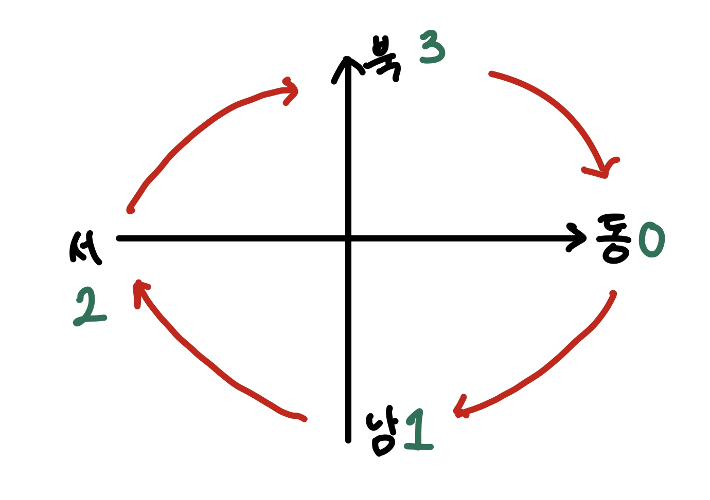 위 그림과 같이 동,서,남,북에 숫자를 적고, 벽을 만날 때마다 방향을 하나씩 더해주도록 하였다. 벽을 만나는 것은 현재 위치에다가 해당하는 dx,dy 배열을 더했을 때, 값이 격자를 넘어가는 것을 뜻한다.