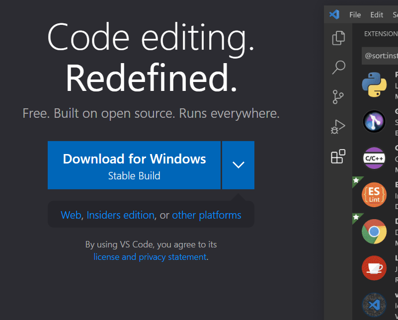 Visual Studio Code is a code editor redefined and optimized for building and debugging modern web and cloud applications. Visual Studio Code is free and available on your favorite platform - Linux, macOS, and Windows.