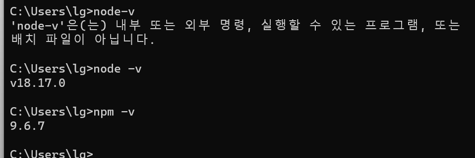 그 다음 node -v와 npm -v를 입력해서 버전 확인하기(-v 앞에 띄어쓰기 안하면 오류나니까 주의)