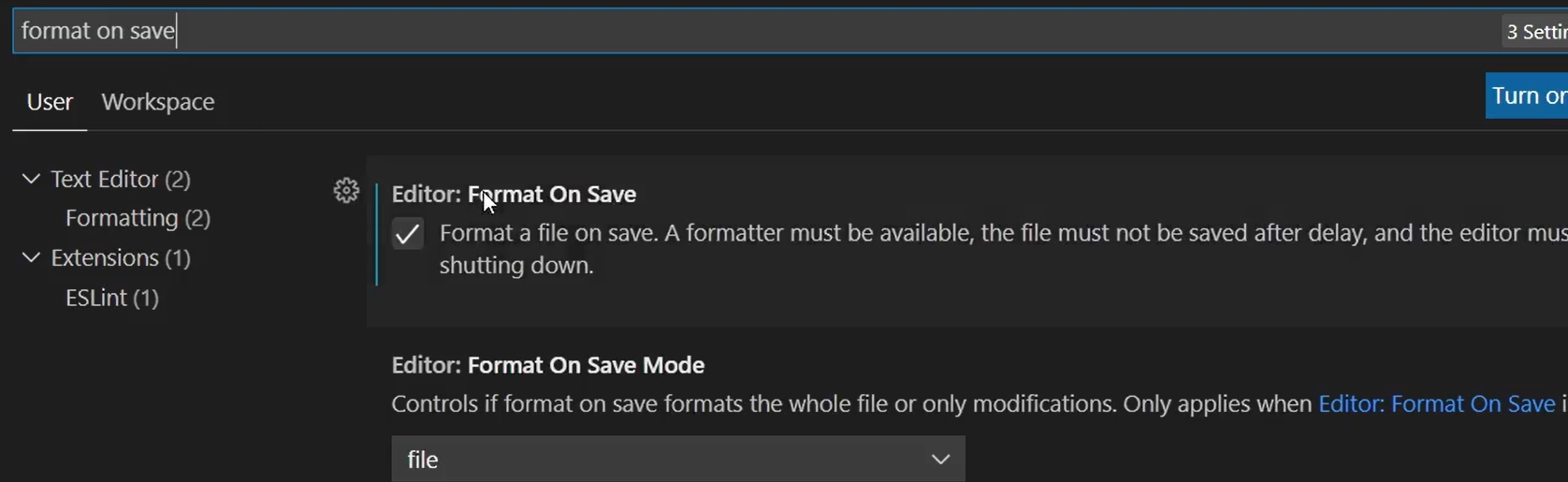 검색창에 format on save를 검색한 후 제일 위에것의 체크박스를 클릭한다.