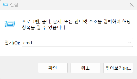 윈도우 + R 버튼을 이용해서 해당 창을 띄워준 다음 cmd를 입력해서 명령프롬포트 열기
