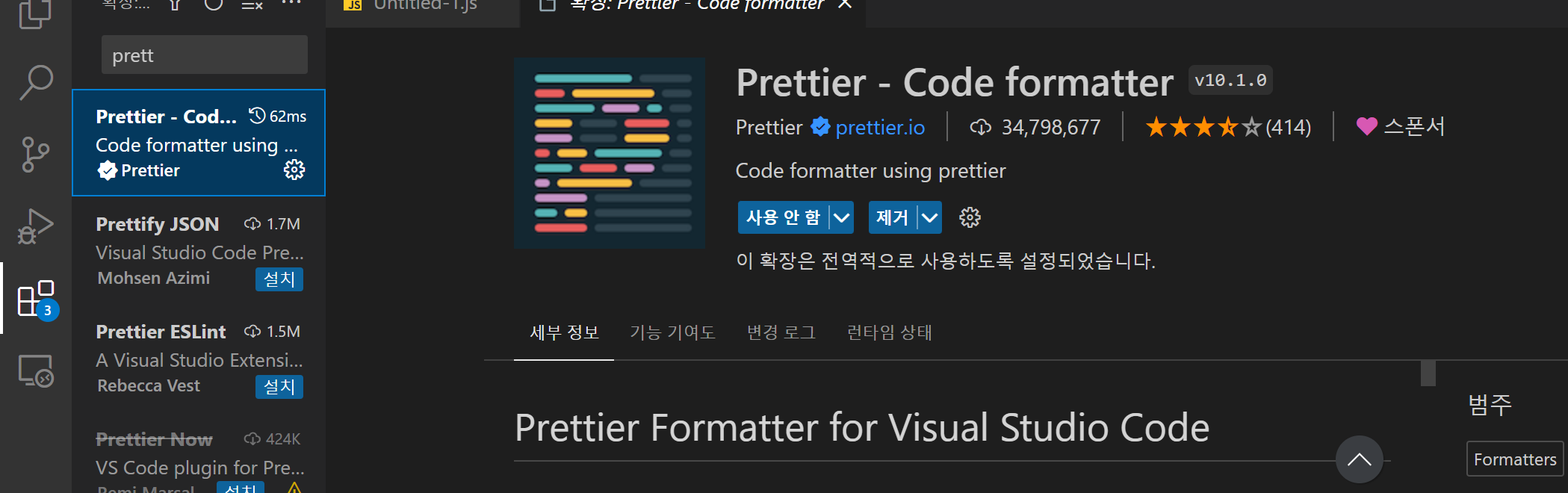 좌측 창에서 확장프로그램 버튼(네모 네개 모양)을 누른 후 prettier 검색하여 설치