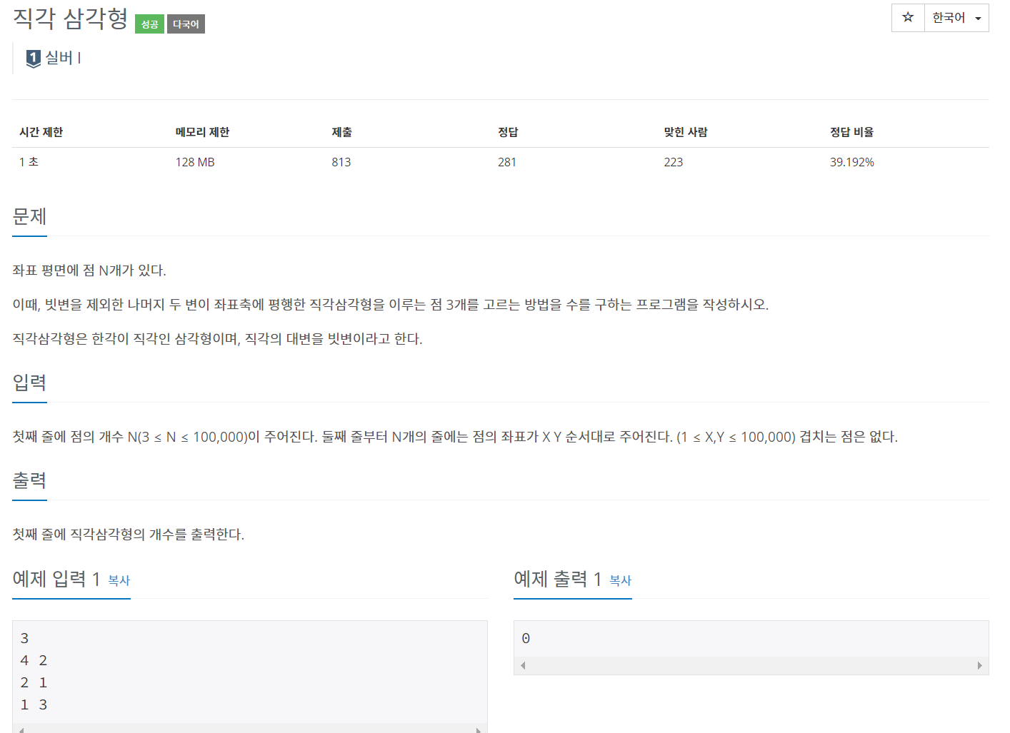 저의 풀이방식은 특정 x좌표의 개수와 y좌표의 개수를 저장하는 배열을 만들고 각 좌표별로 기준이 되었을 때 몇 개의 직각삼각형이 만들어질 수 있는지를 cnt에 더하는 방식으로 진행을 했습니다.